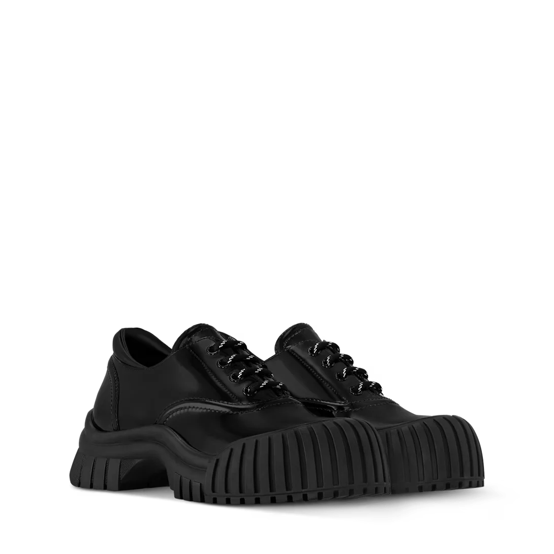 本款 Ruby 系带德比鞋以亮泽漆面牛皮革塑造潮流轮廓。厚实而不失轻盈的橡胶外底搭配双色鞋带,展现亦刚亦柔的前卫姿态。别致竖直棱纹与撞色路易威登标识点缀外底,点明 Ruby 系列的标志性设计。