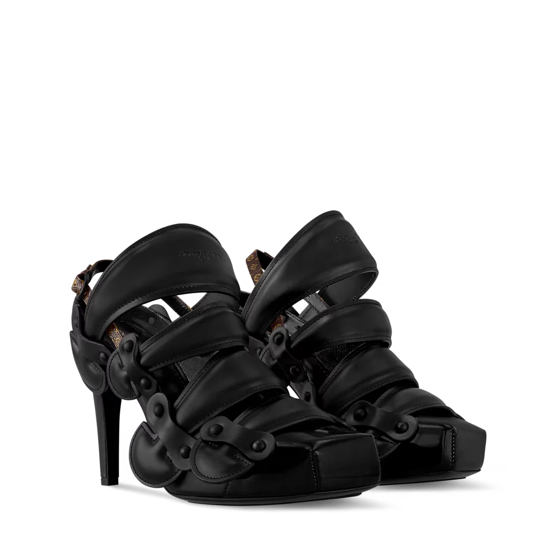 本款 Legacy 露跟高跟鞋以光滑牛皮革延续传统构型设计,瞩目亮相 2025 春夏秀场。不对称方形鞋头与路易威登硬箱手柄形状鞋带增添别致韵味,可调节 Monogram 帆布后带完善整体。