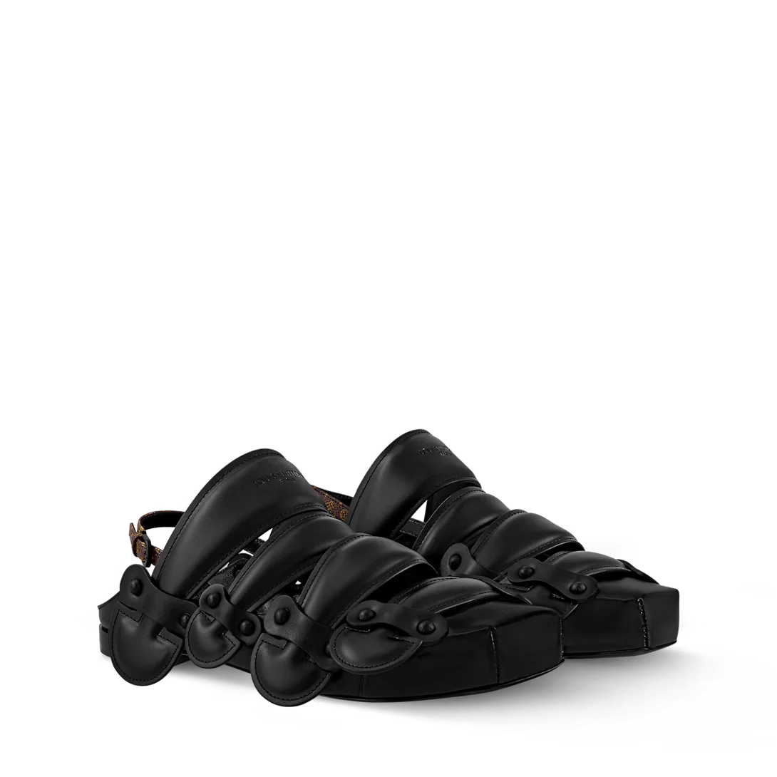 本款 Legacy Closed 平底凉拖以柔软牛皮革构型延续品牌旅行传统,瞩目亮相路易威登 2025 春夏秀场。不对称方形鞋头与硬箱手柄形状鞋带释放前卫锋芒,同色饰钉与可调节 Monogram 帆布后带完善整体。