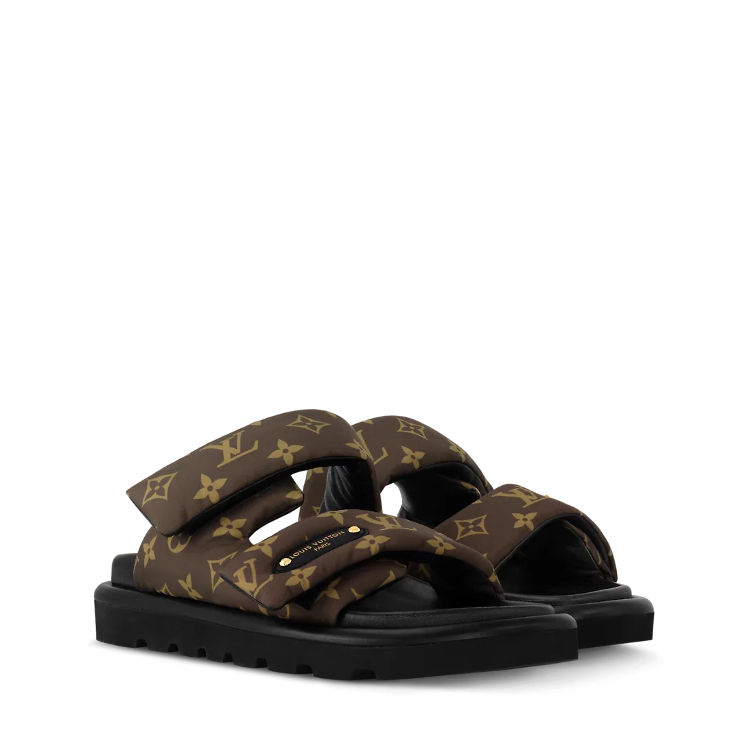 本款 Pool Pillow comfort 平底凉拖取材 Monogram 锦纶,以可调节加衬鞋带焕新回归。皮革内衬提升舒适耐磨质感。鞋面鞋带缀有压印路易威登标识的皮革标签。韧性鞋垫与轻盈微型外底完善整体。