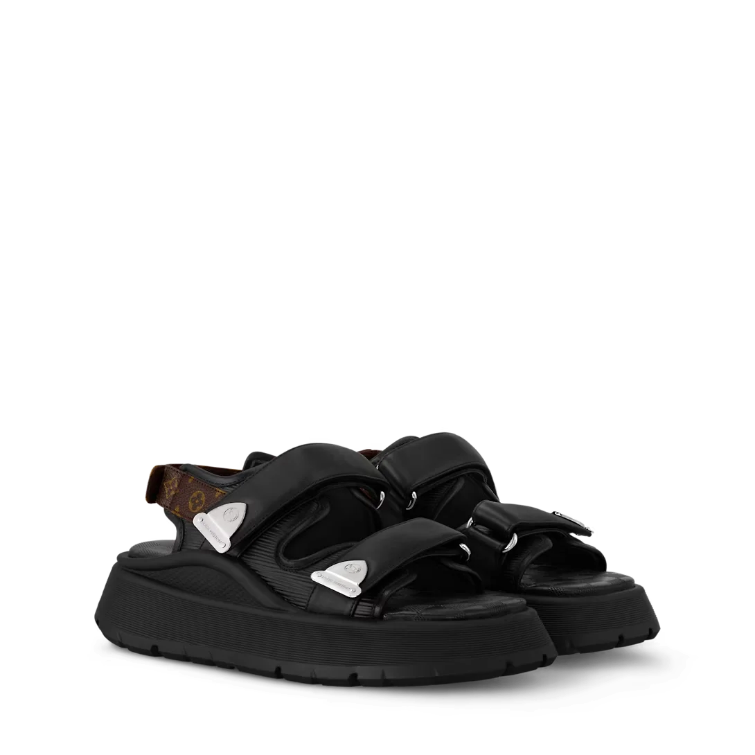 本款 Chameleon 凉鞋取材牛皮革,巧妙营造舒适畅行的穿着体验。正面硬箱包角元素鞋带与后部 Monogram 帆布鞋带均拥有可调节魔术贴,厚实而轻盈的防水台外底援引 LV Archlight 运动鞋的波浪细节。