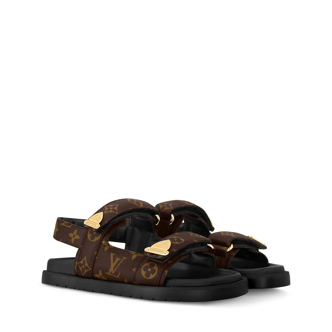 本款 LV Sunset Comfort 凉鞋选用经典 Monogram 帆布诠释休闲风范,为可调节魔术贴鞋带融入别致金属细节与品牌标识铭纹,展现硬箱包角设计的灵感启发。加衬韧性鞋垫与轻盈橡胶外底再添舒适体验。