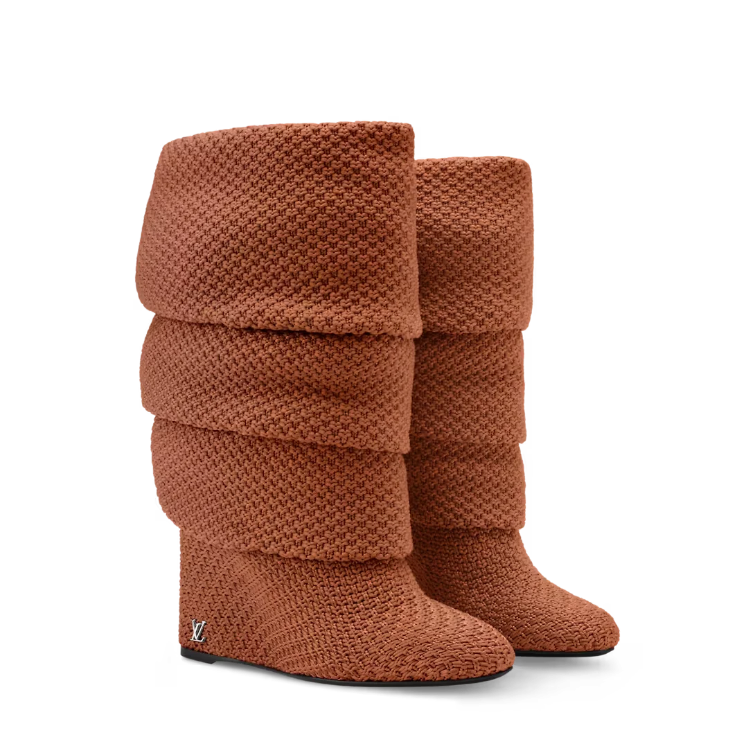 Summer 中坡跟靴子于 2025 秋冬女装秀场瞩目亮相,以珠皮呢针织演绎迪斯科时代的璀璨风华。慵懒轮廓与优雅坡跟相得益彰,LV 字母饰钉再度标注品牌印记。