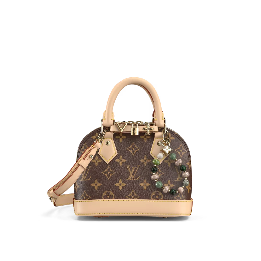LV&I 系列推出定制套装,可令经典 Alma 迷你手袋张扬个性意趣。先选择心仪包款,然后挑选肩带或链条,接着随心添缀镜子名牌或发夹等挂饰,再以三款滑入式装饰(挂锁、缤纷 Vivienne 吉祥物等)完善点睛笔触。
