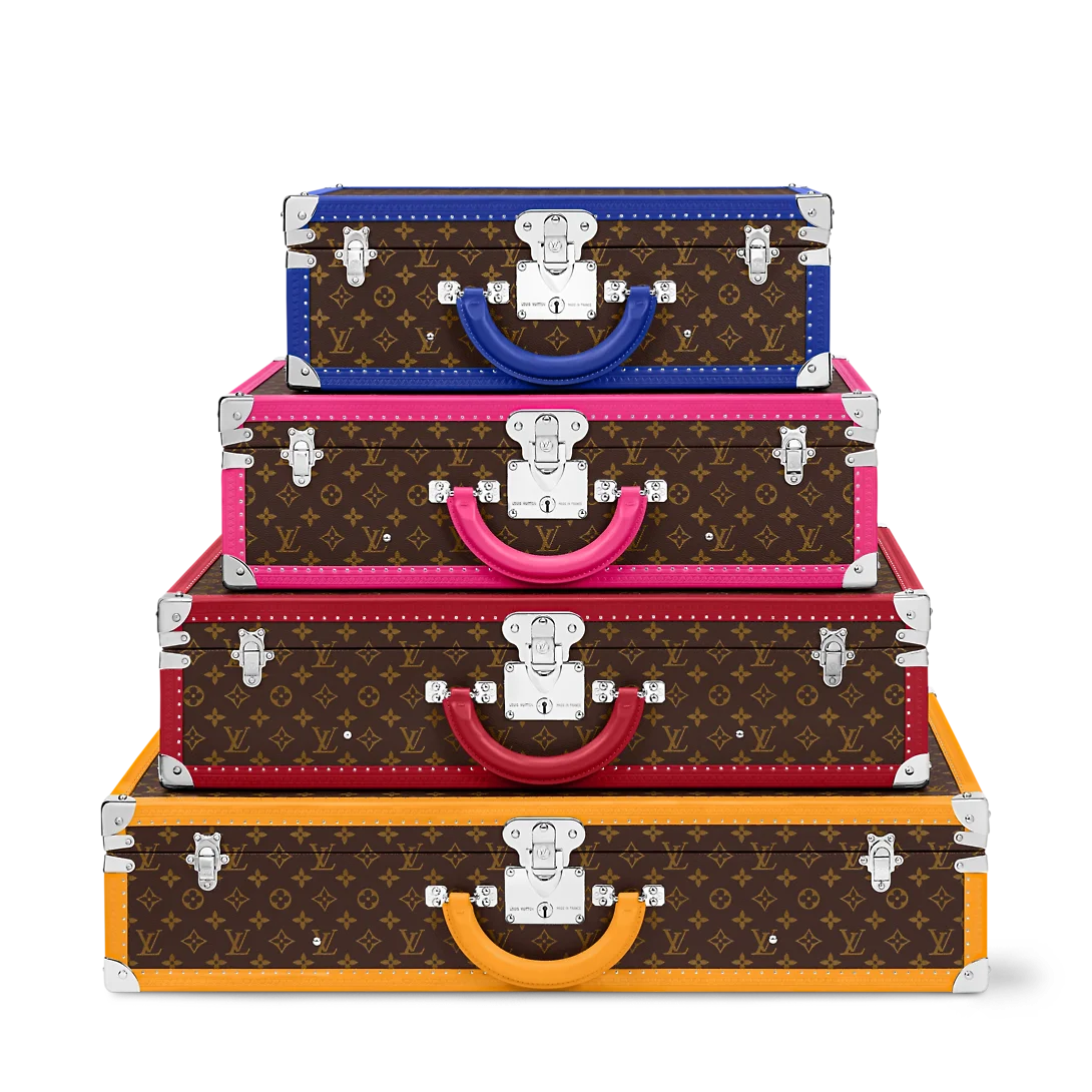 Pyramide Bisten 50 – 80 硬箱套装出自 LV Colormania 系列,为 Monogram 帆布融入明亮皮革饰边,后者与内衬的色彩巧妙呼应。考究构型与莹润金属件共同道出路易威登的制箱传承。