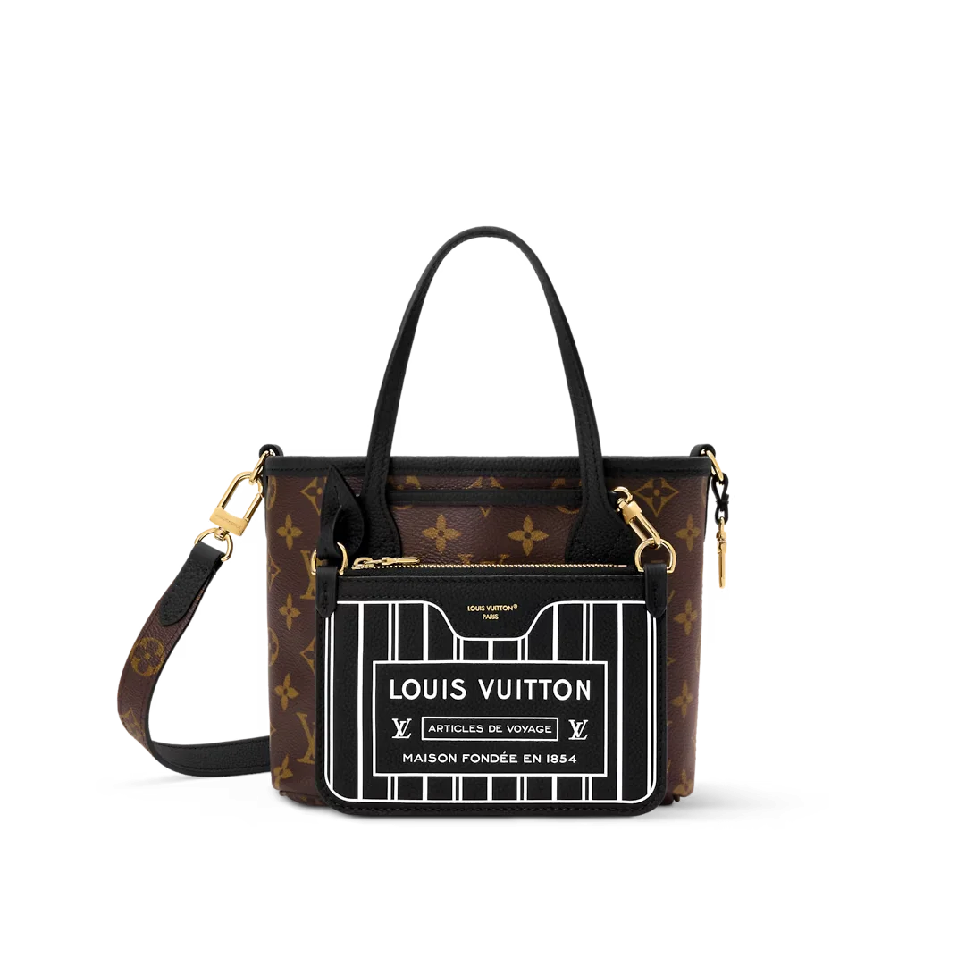 Neverfull Bandoulière Inside Out BB 手袋本季演绎经典设计的双面版本,以标志性 Monogram 帆布和粒面皮革分饰正反面。可拆卸拉链袋既可单独使用,亦可悬挂于外部。可拆卸肩带方便斜挎,耀目金属件再添考究细节。